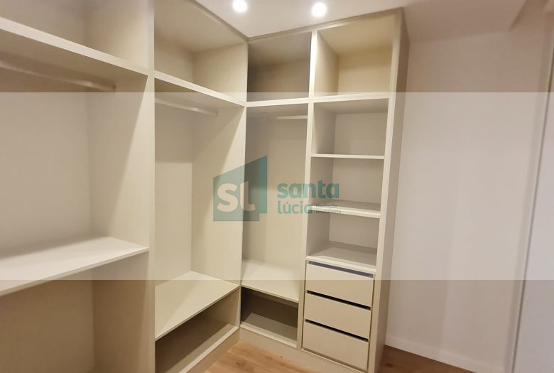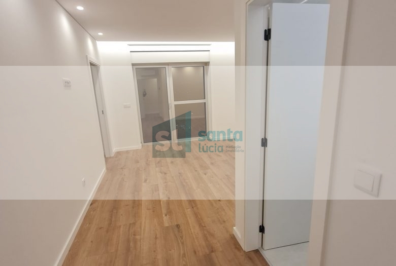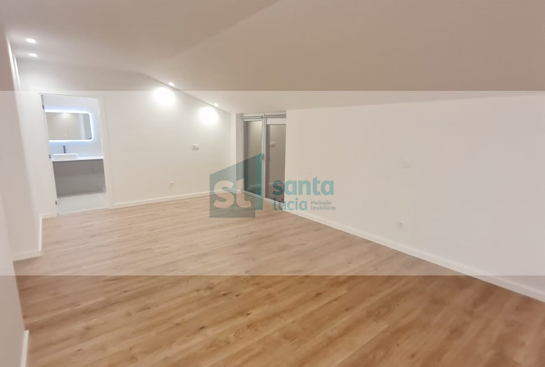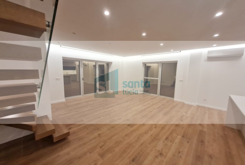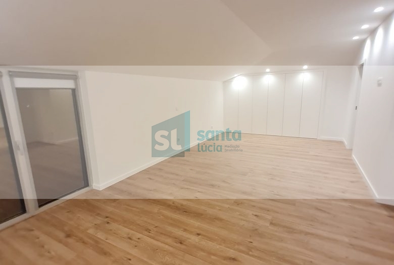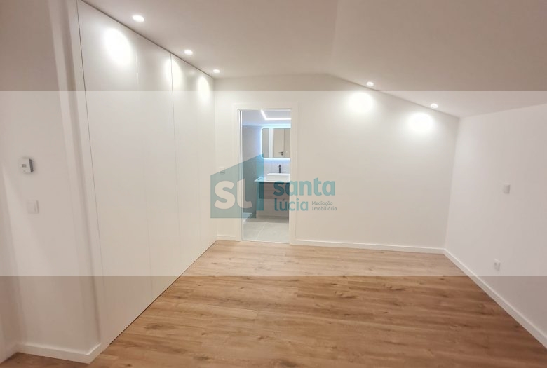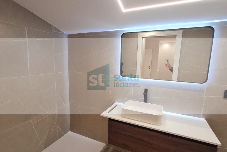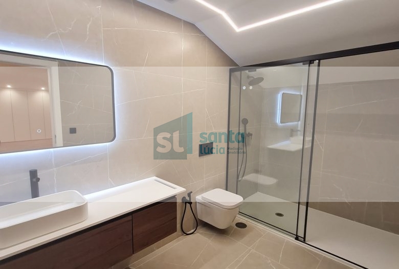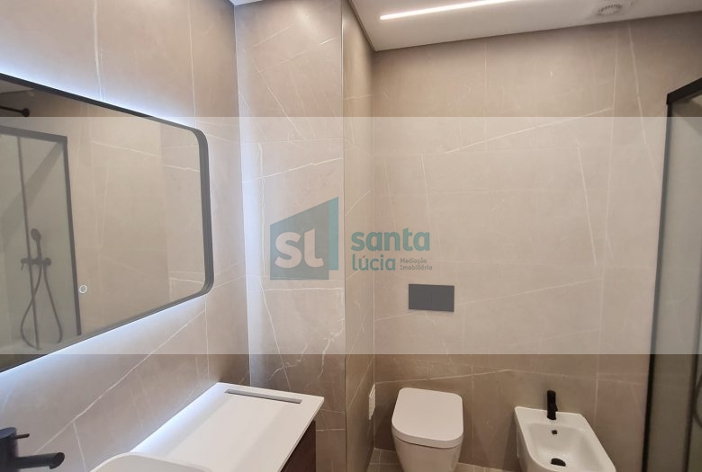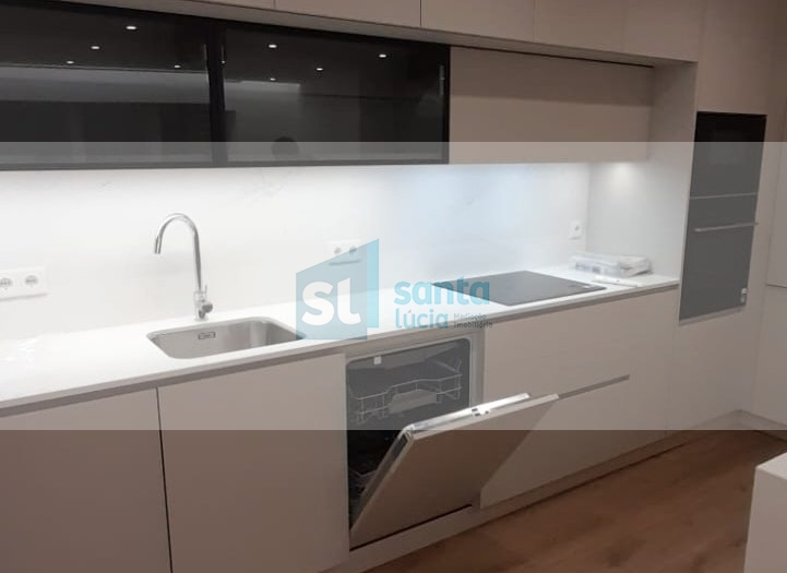 O apartamento tem piso radiante, ar condicionado, painéis fotovoltaicos e ainda uma garagem com áreas muito generosas e com portão automatizado.