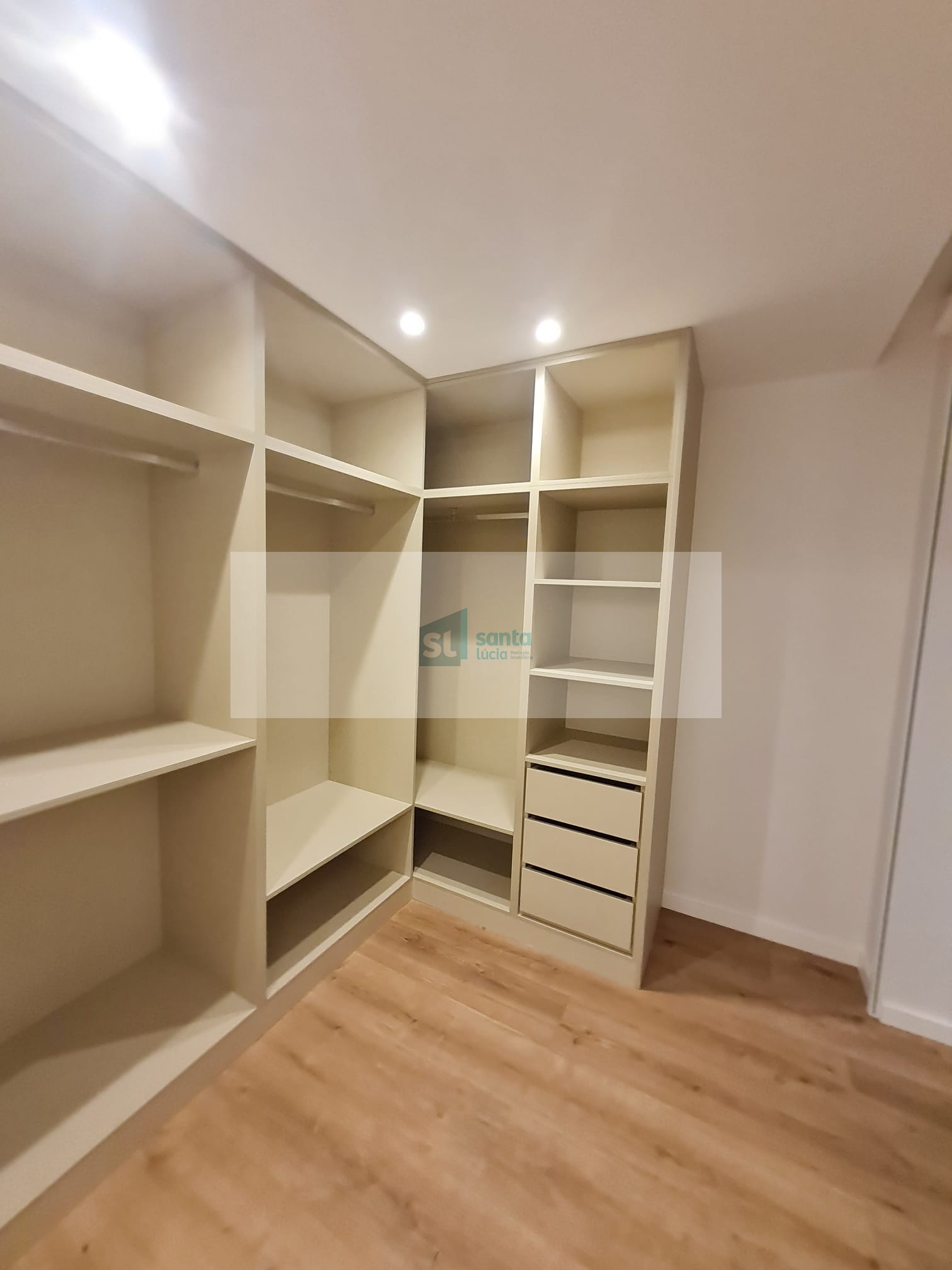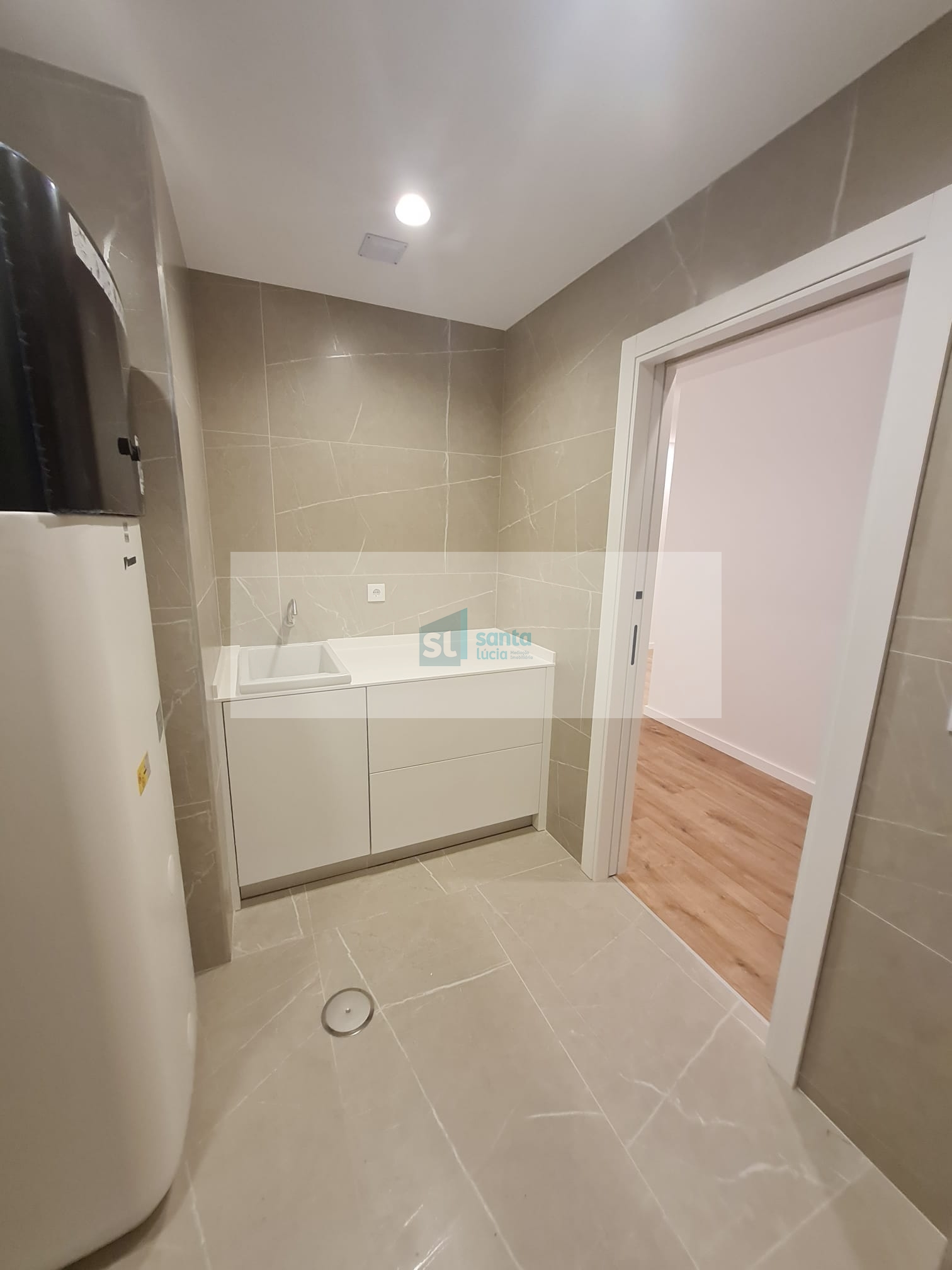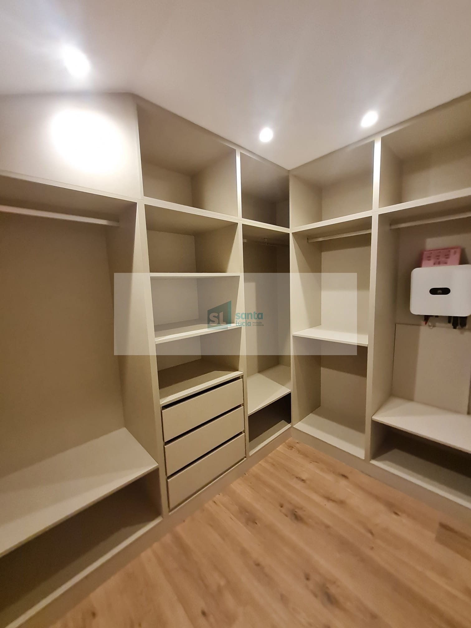 O apartamento tem piso radiante, ar condicionado, painéis fotovoltaicos e ainda uma garagem com áreas muito generosas e com portão automatizado.