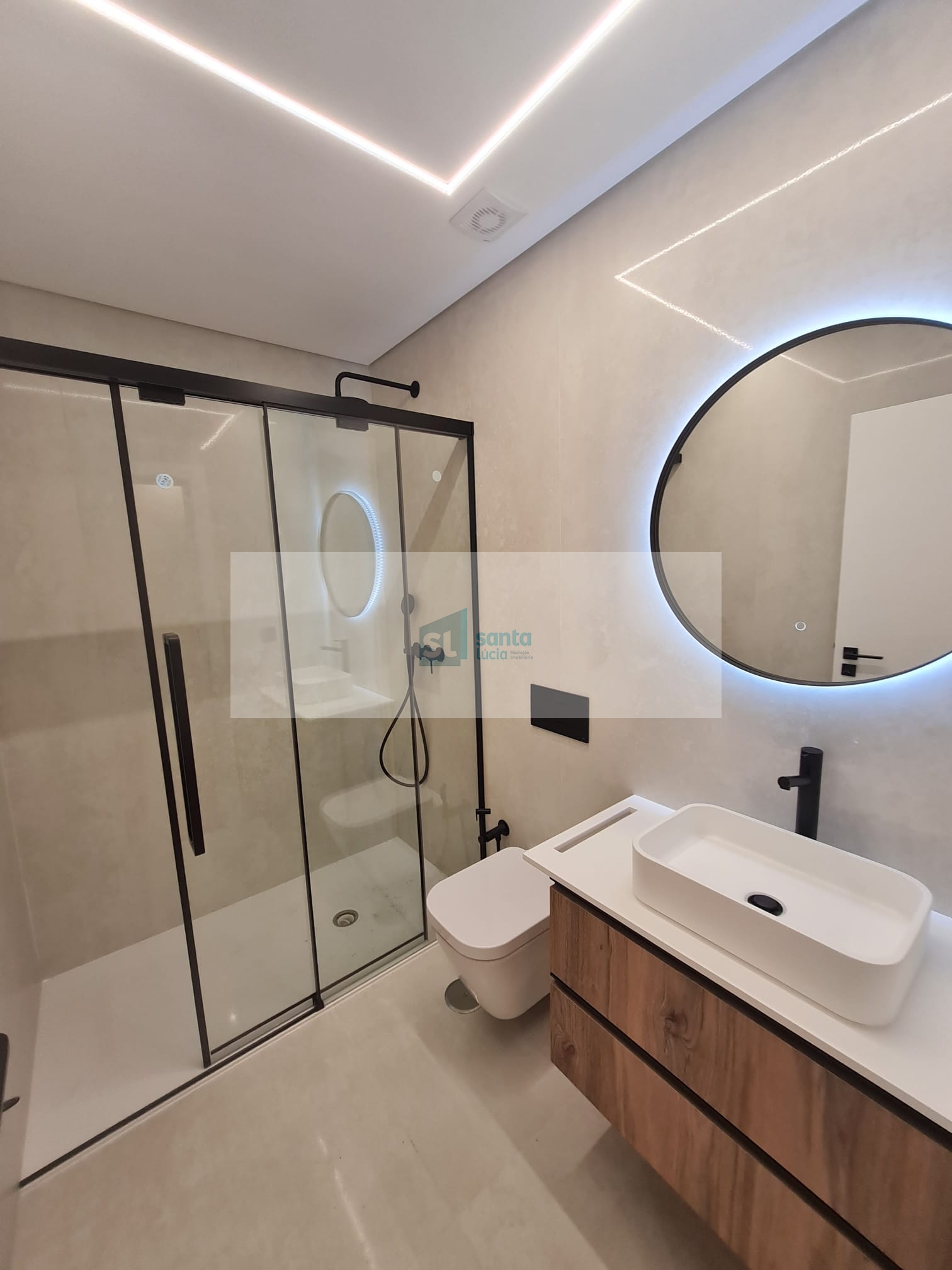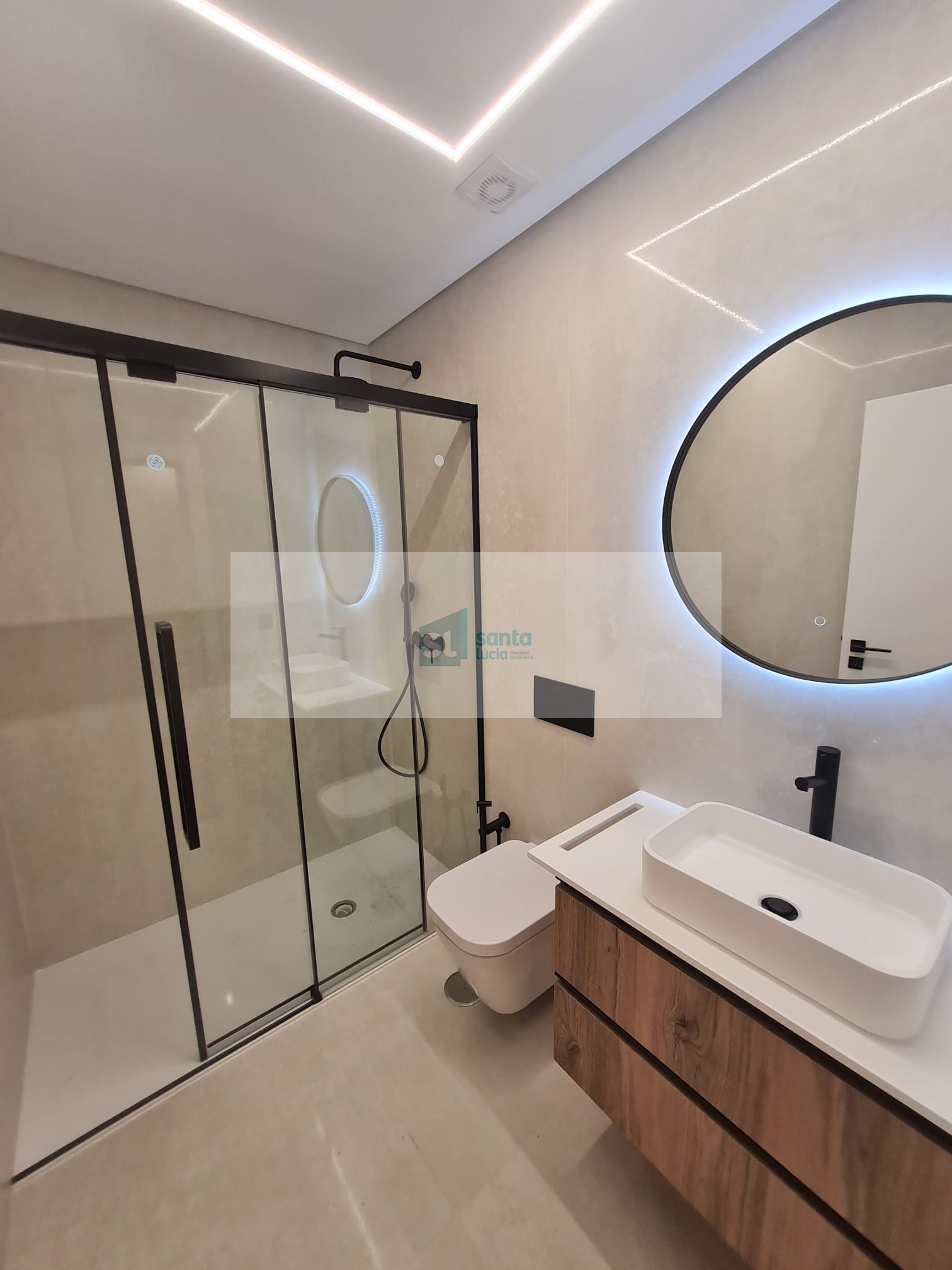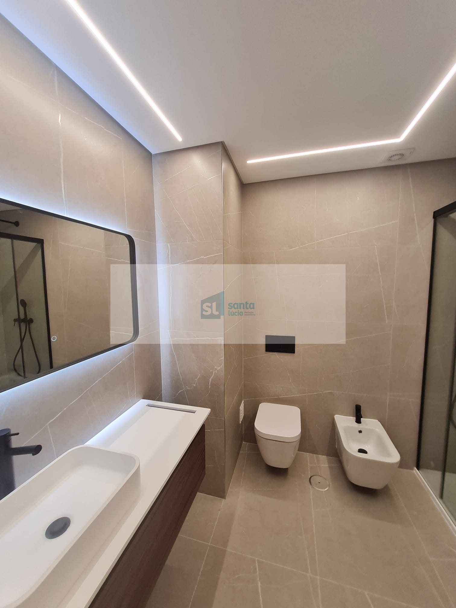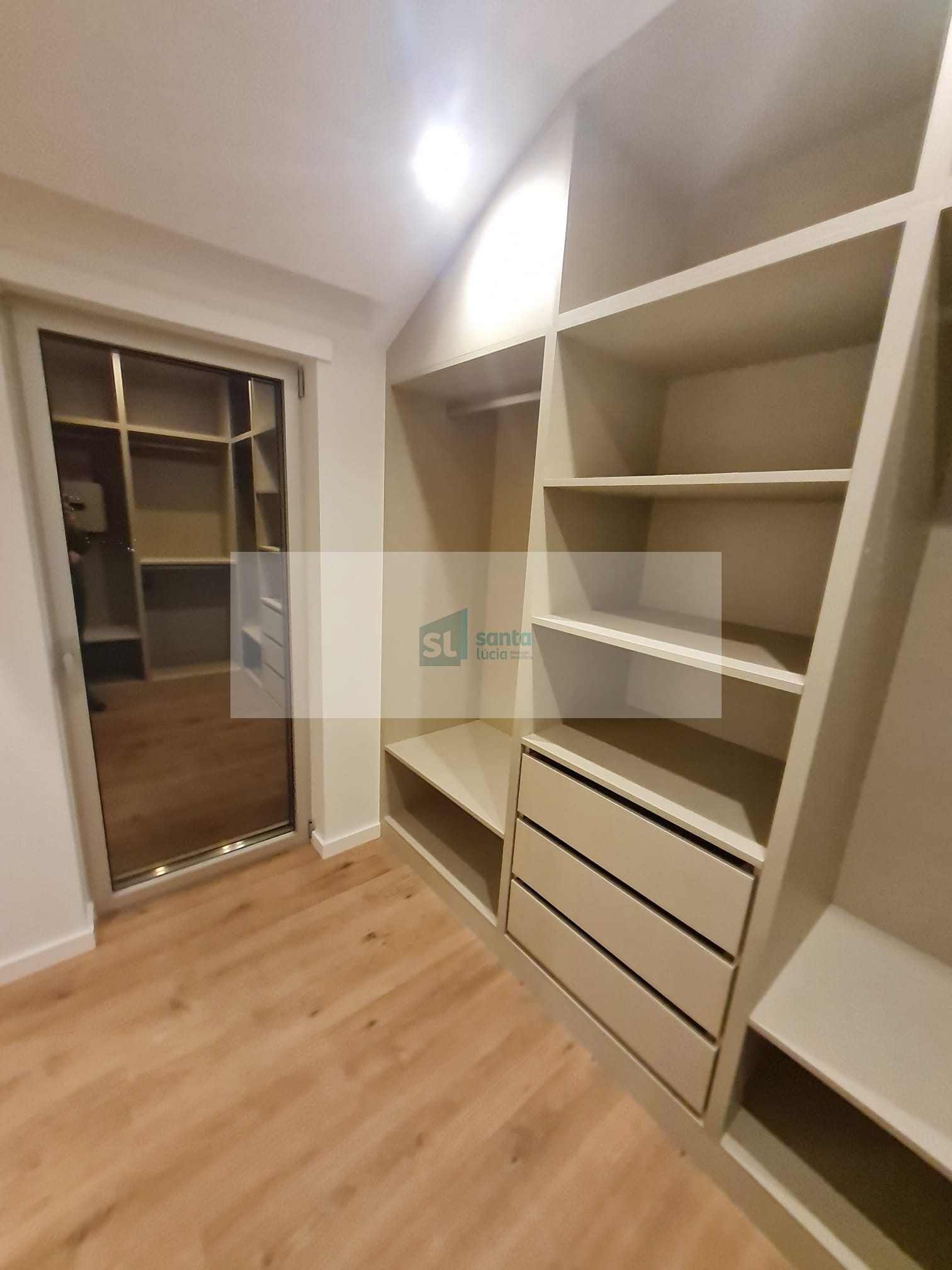 O apartamento tem piso radiante, ar condicionado, painéis fotovoltaicos e ainda uma garagem com áreas muito generosas e com portão automatizado.
