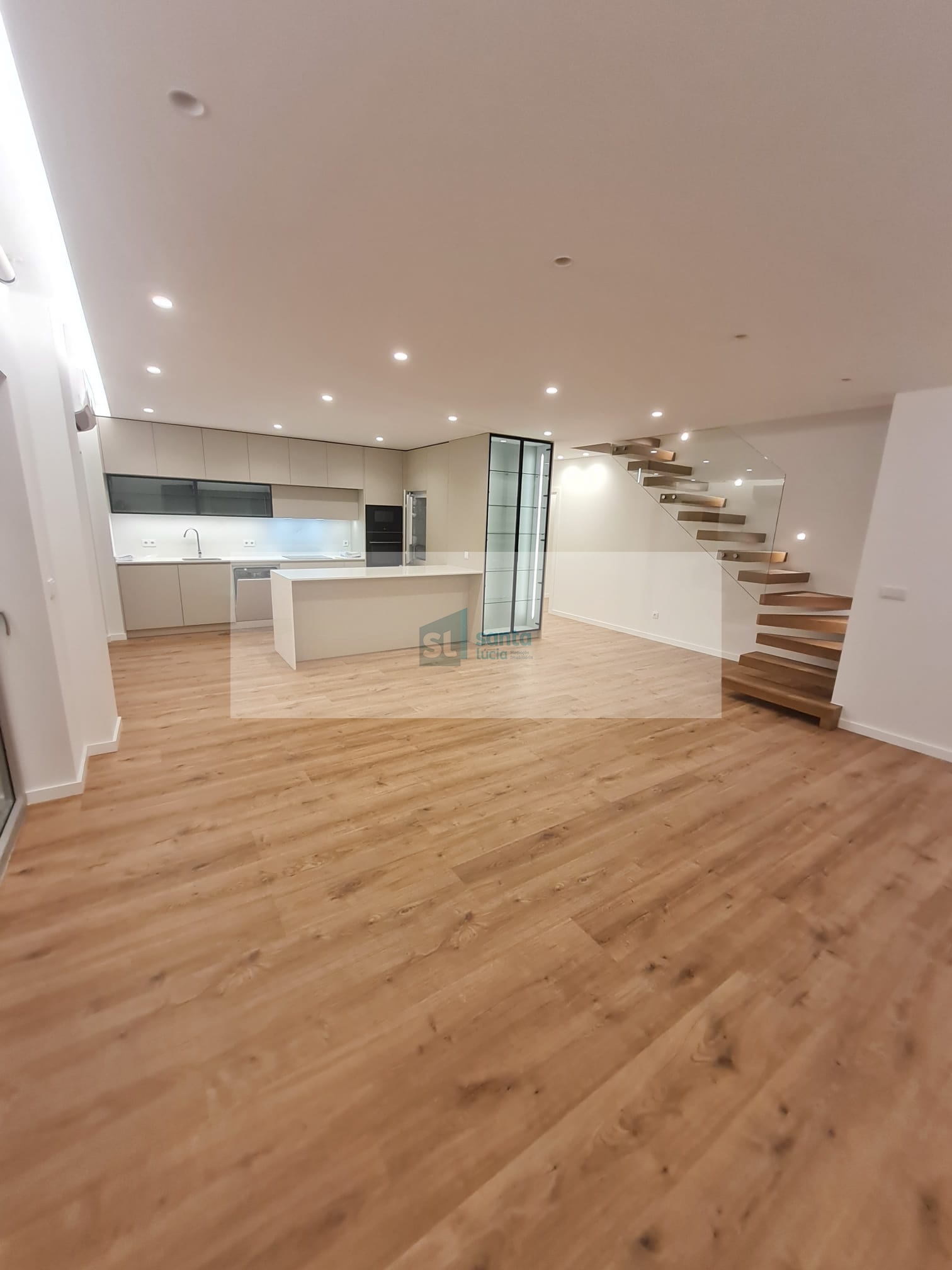 O 1.º piso é composto por cozinha e sala em open space, a cozinha está equipada com placa de indução, exaustor, frigorifico, máquina de lavar a roupa tudo da marca Bosh, dois quartos ambos com closet, um deles com suite e outro com varanda, no hall privado temos um roupeiro embutido e uma casa de banho completa.