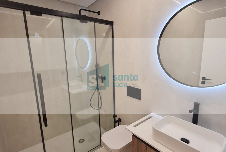 O 1.º piso é composto por cozinha e sala em open space, a cozinha está equipada com placa de indução, exaustor, frigorifico, máquina de lavar a roupa tudo da marca Bosh, dois quartos ambos com closet, um deles com suite e outro com varanda, no hall privado temos um roupeiro embutido e uma casa de banho completa.