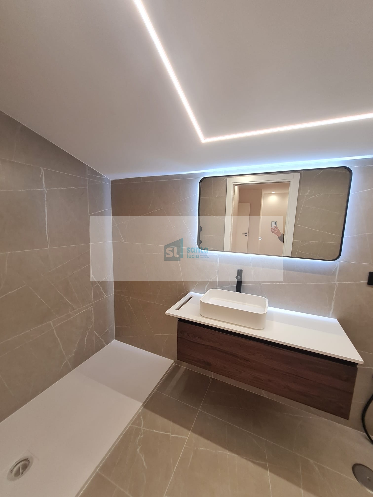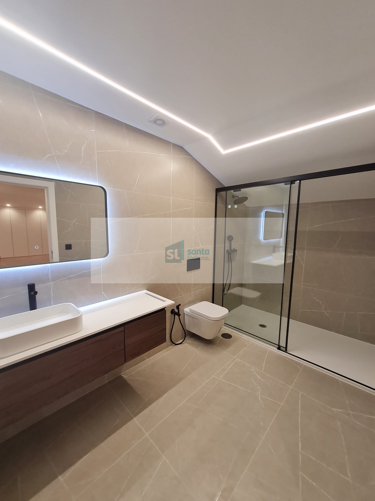 O apartamento tem piso radiante, ar condicionado, painéis fotovoltaicos e ainda uma garagem com áreas muito generosas e com portão automatizado.